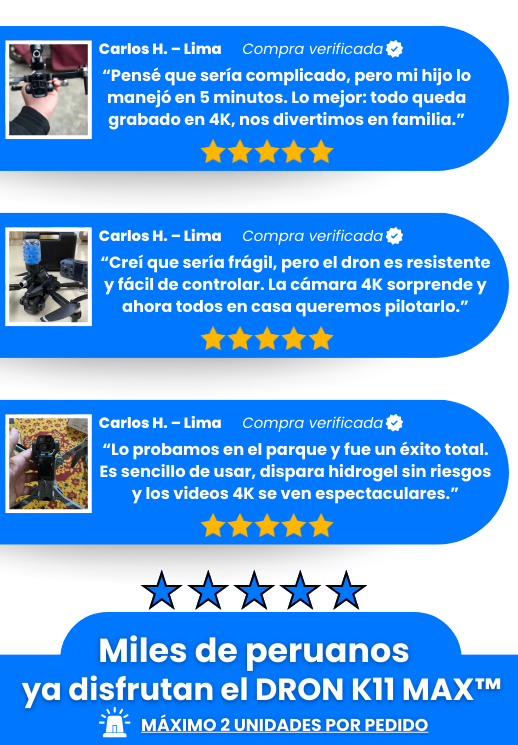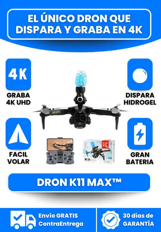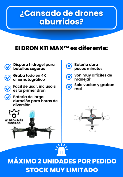 La mayoría de drones se sienten iguales: vuelan un rato, graban en baja calidad y terminan guardados en un cajón. El K11 MAX™ es diferente: dispara hidrogel, graba en 4K y transforma cualquier momento en una batalla épica llena de risas, adrenalina y recuerdos únicos.